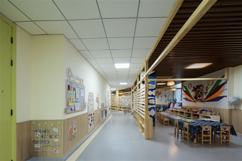 設(shè)計團(tuán)隊秉承“文化根系·生態(tài)課堂”的核心理念,實現(xiàn)了三大創(chuàng)新突破:文化傳承創(chuàng)新,巧妙解構(gòu)傳統(tǒng)藏式建筑語匯,以象征性的“煨桑臺”形態(tài)塑造入口空間,并運(yùn)用夯土墻、木質(zhì)格柵等本土材料與工藝,喚醒地域文化記憶。生態(tài)教育融合,充分利用場地自然高差,構(gòu)建多層級生態(tài)活動圈。設(shè)置屋頂農(nóng)場、戲水溪谷、觀星臺等多元互動空間,鋪設(shè)出一條“從土壤到星空”的自然認(rèn)知與探索路徑。兒童友好設(shè)計,深度契合3-6歲兒童行為特征,引入模塊化家具系統(tǒng),并融入光影劇場、交互藝術(shù)墻等智慧化設(shè)施,充分激發(fā)幼兒的好奇心、探索精神與創(chuàng)造力。