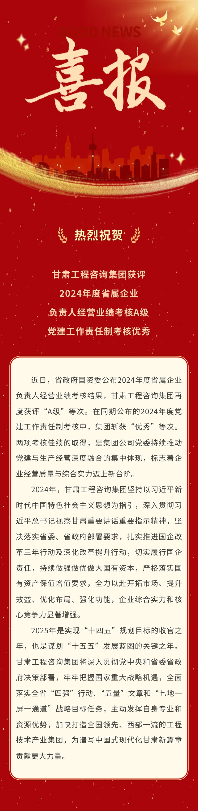 喜報 | 甘肅工程咨詢集團榮獲2024年度省屬企業(yè)考核“雙優(yōu)”佳績:經(jīng)營業(yè)績考核A級、黨建工作責任制考核優(yōu)秀
