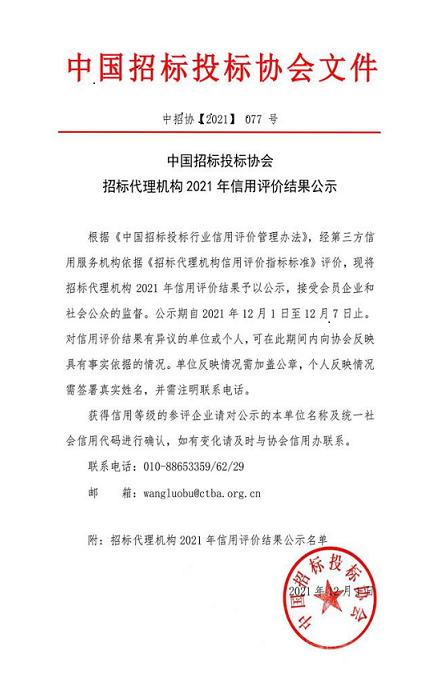 近日,在中國招標投標協(xié)會牽頭組織的2021年招標代理機構(gòu)級信用評價認證工作中,經(jīng)中招協(xié)委托的第三方信用服務機構(gòu)(國資委)商業(yè)信用中心及有關(guān)行業(yè)專家評審,招標咨詢集團子公司甘肅省招標中心有限公司和甘肅金安建設(shè)工程項目管理有限公司獲得2021年招標代理機構(gòu)AAA級信用評價最高等級認證。