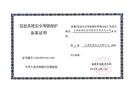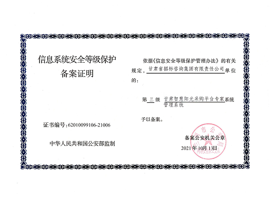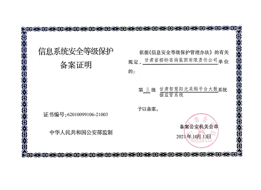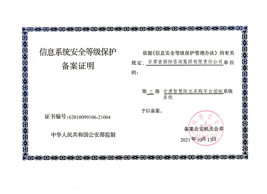 近日,由招標咨詢集團負責開發(fā)建設(shè)的甘肅智慧陽光采購平臺系統(tǒng),以及甘肅智慧陽光采購平臺采購網(wǎng)系統(tǒng)、大數(shù)據(jù)監(jiān)管系統(tǒng)、招標系統(tǒng)、保證金系統(tǒng)、專家管理系統(tǒng)通過國家三級等保認證,系統(tǒng)管理安全能力獲得業(yè)界最高標準。