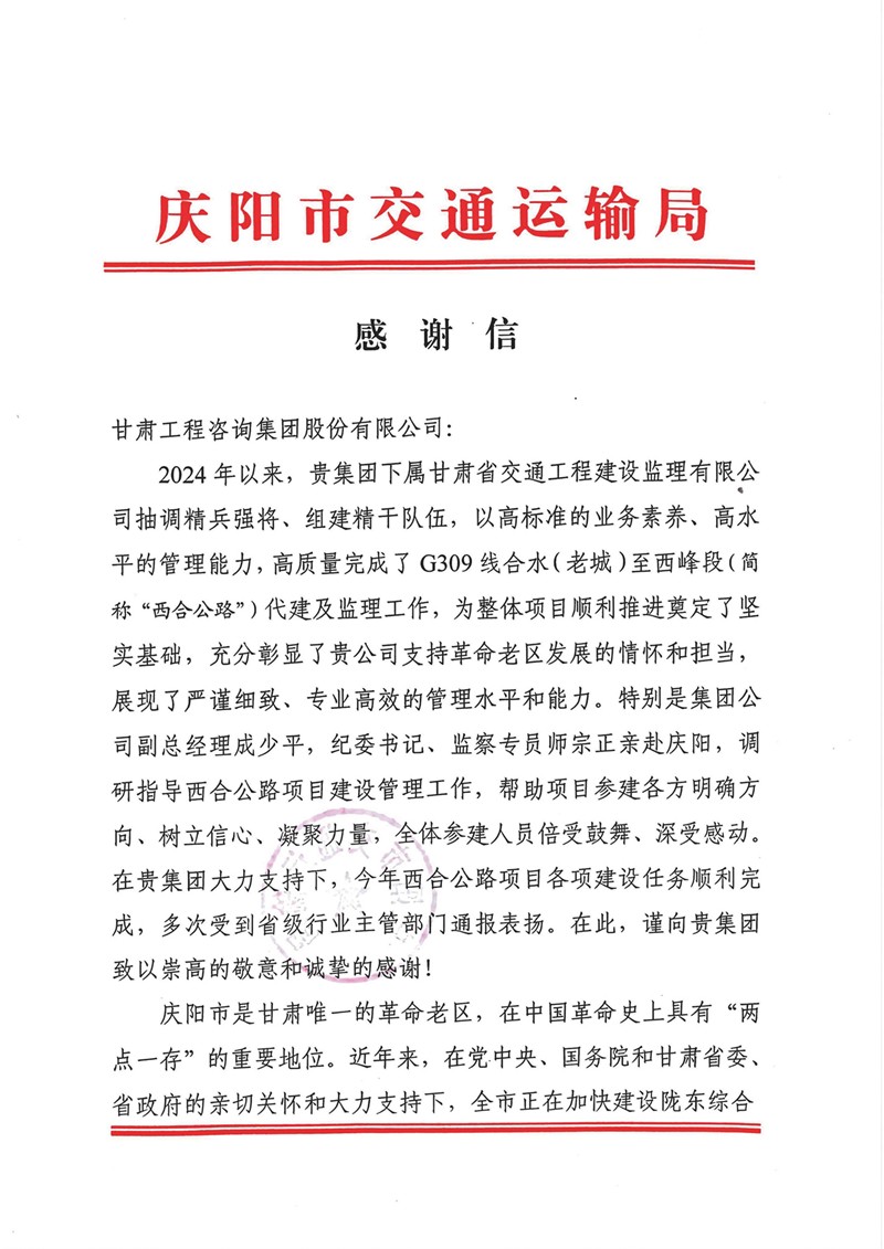 慶陽市交通運輸局向甘肅工程咨詢集團發來感謝信