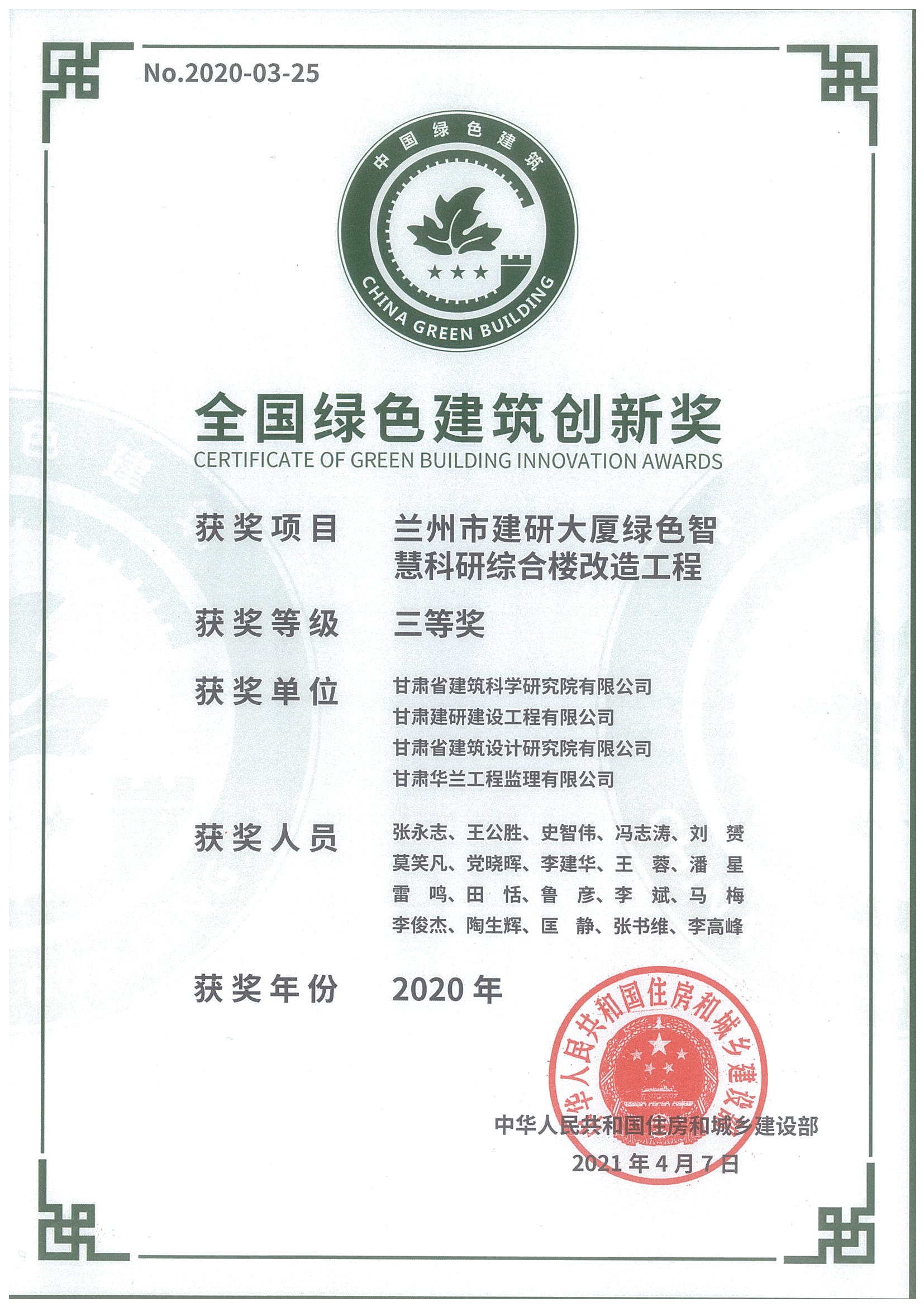 全國綠色建筑創新獎(蘭州市建研大廈綠色智慧科研綜合樓改造工程)
